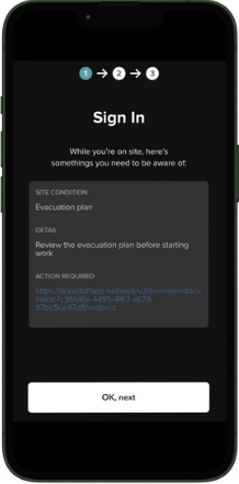 Acknowledge any known risks / conditions associated with this location, tap "OK, next" to continue