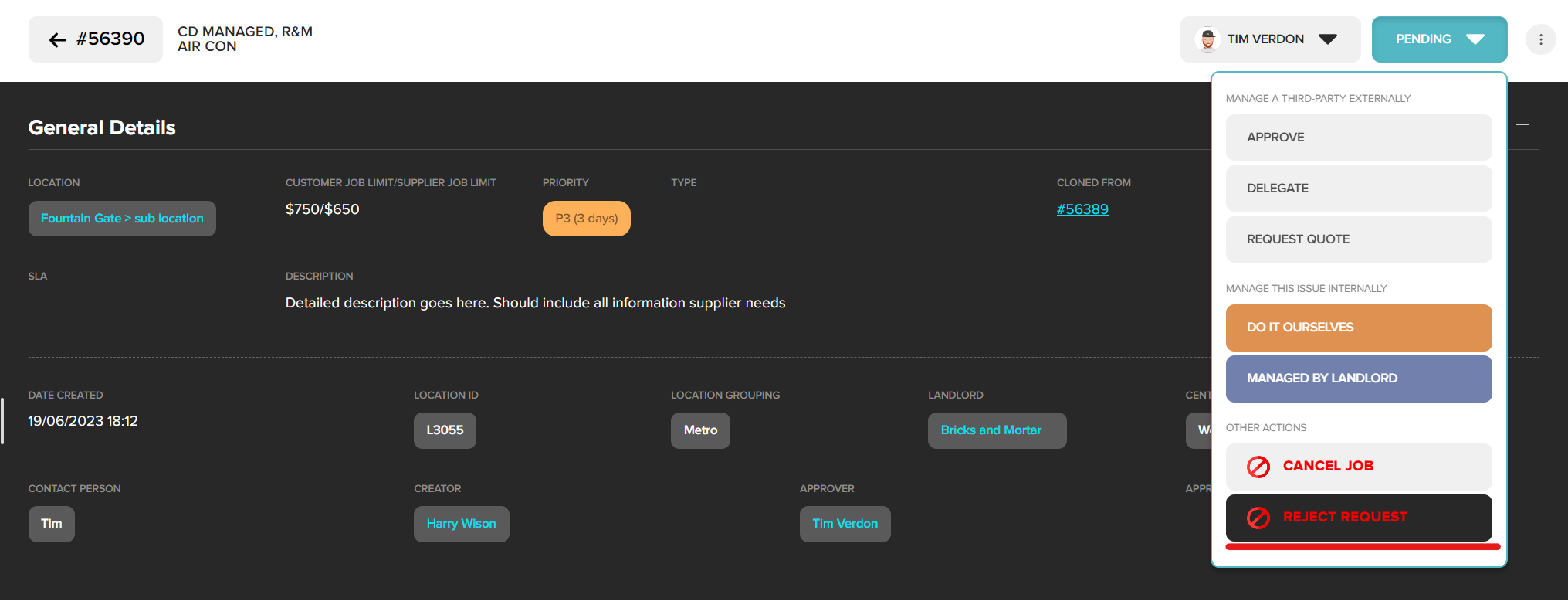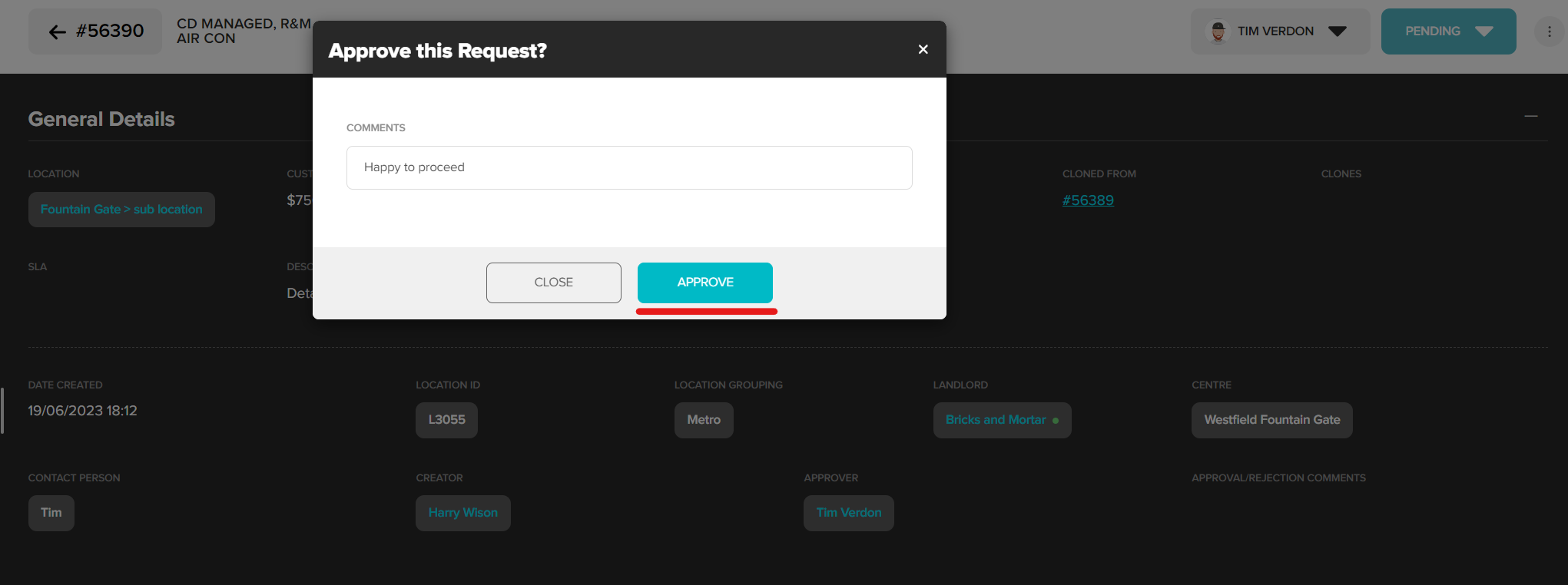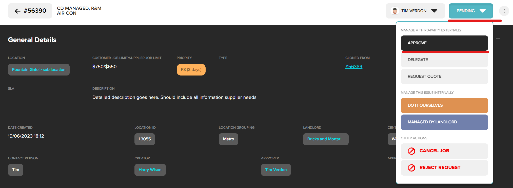 After reviewing the information provided and confirming it is detailed enough for the supplier to action in full (detailed description, photos included, asset added if applicable etc), click Approve from the action bar.