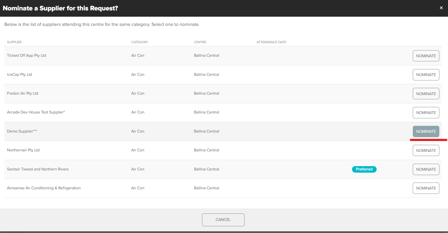 Suppliers who have been configured to service this Location / Subcategory will be listed. Click Nominate to select
