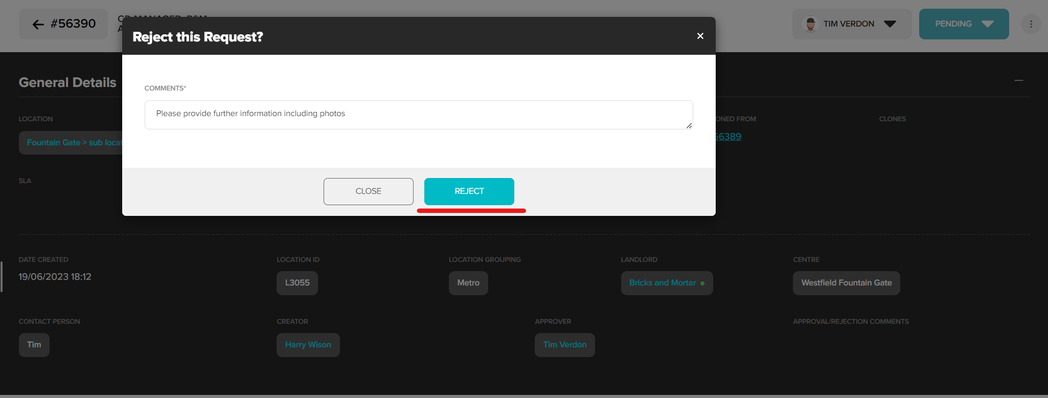 Enter a rejection comment and click Reject. Rejection comment will be saved against request and included in email notification.