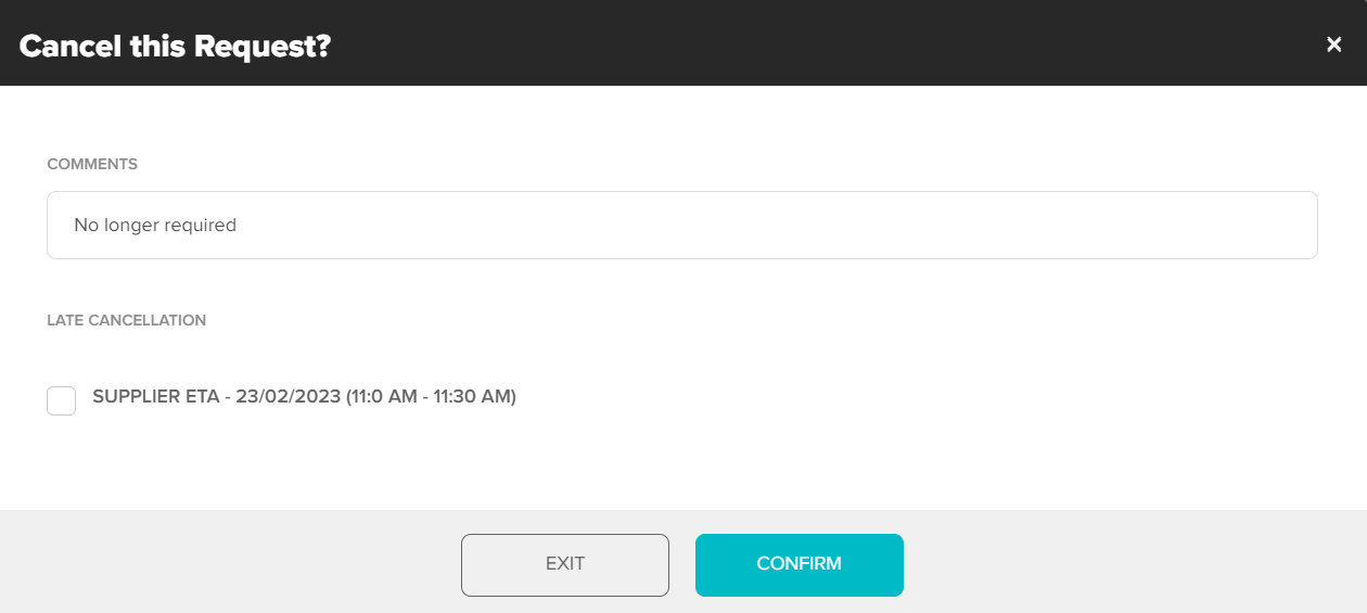 Enter a cancellation note (will be included in cancellation notification and be visible on WR) select Confirm to cancel