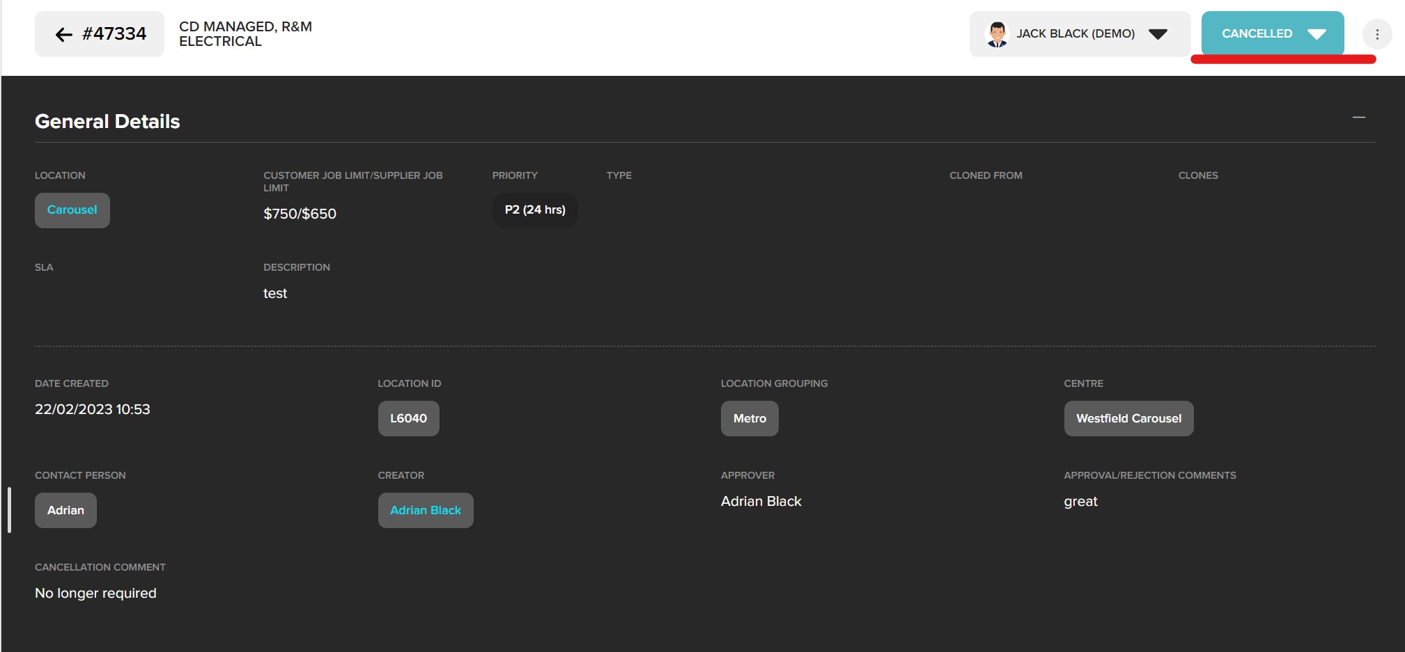 The status of this request will now be changed to cancelled