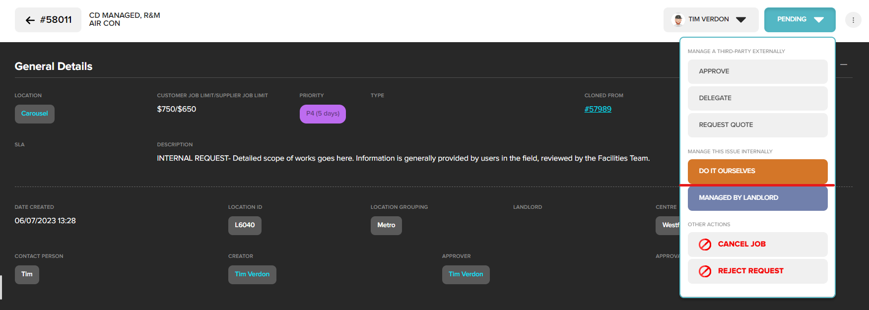 To mark a request as Internal, we use the Do it Ourselves function via the action bar.