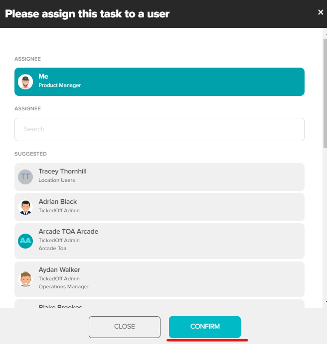 Via the pop up box, assign the user who is responsible for completing this request (you can assign to yourself). Click Confirm to select.