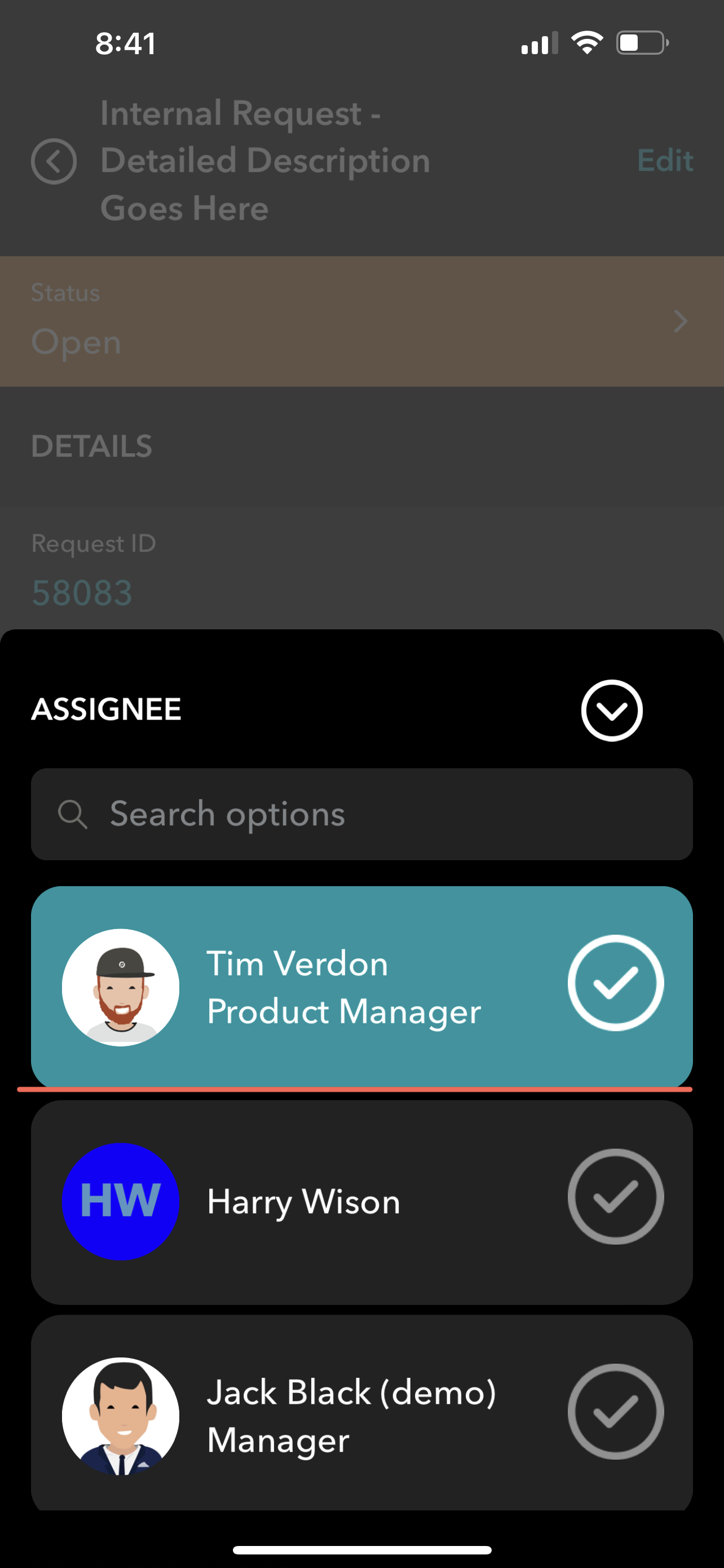 You can reassign requests to another user by clicking on the current assignees name. Search / select the new assignee. Click Confirm. User will be notified via email and push notification that a request has been assigned for them. Assigned request will be listed in this users “My Tasks” tab.