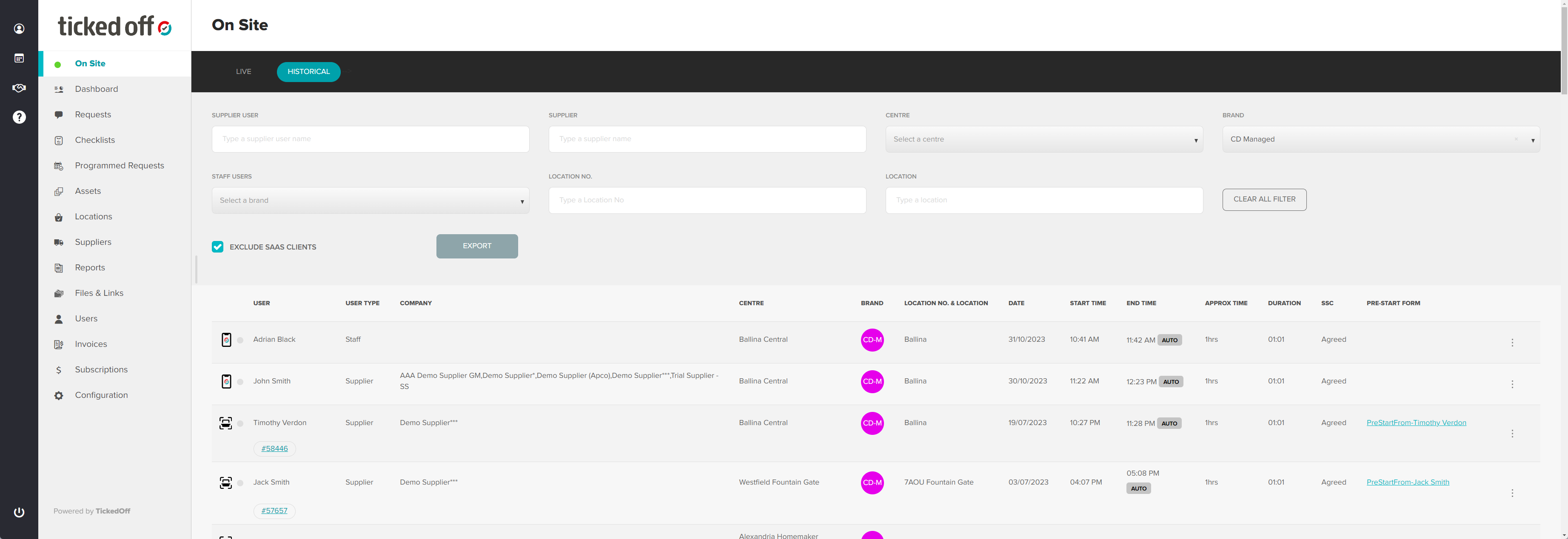 The On Site tab (web platform) provides a record of staff coming in and out.