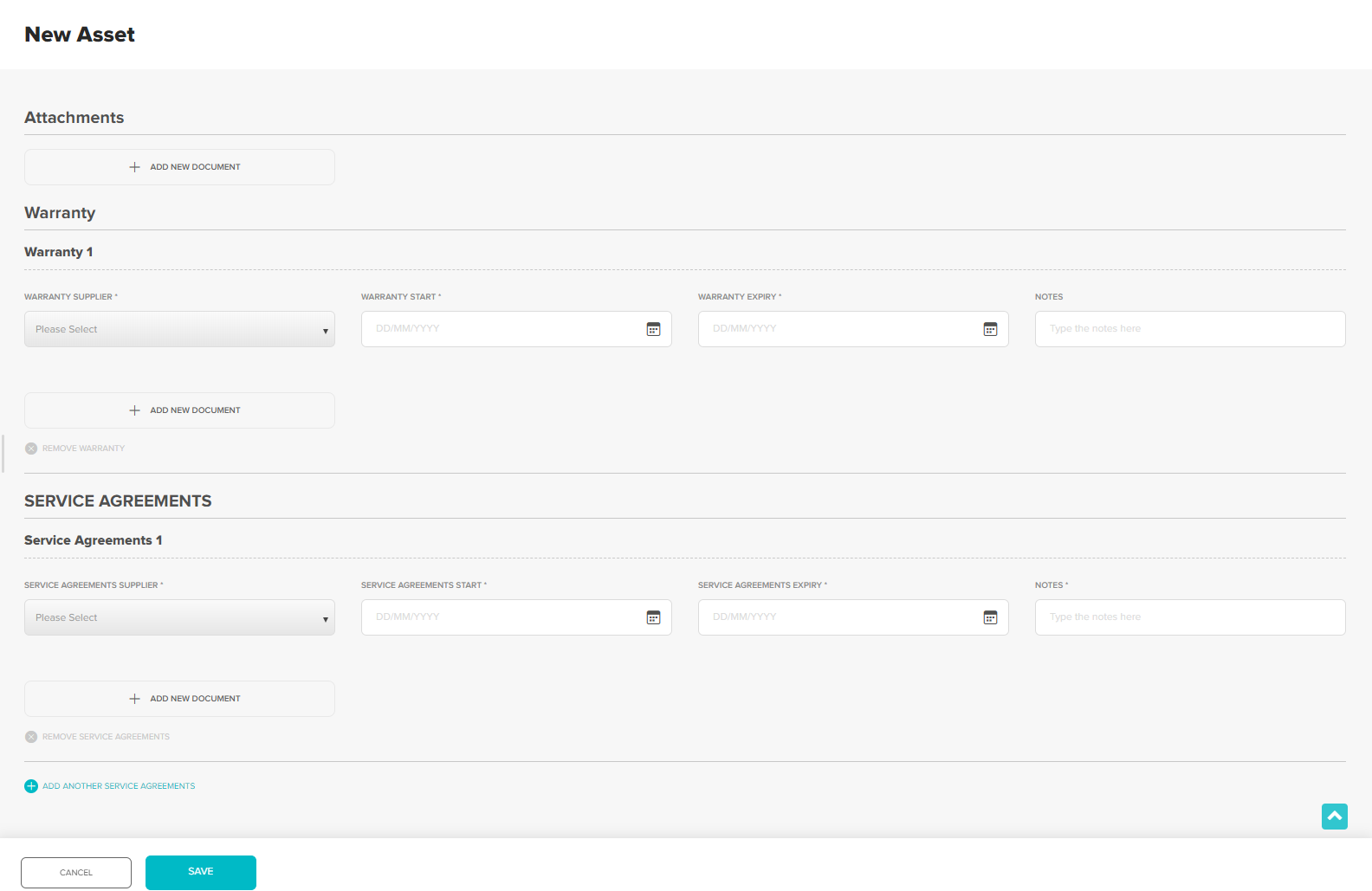 Warranty and Service Agreements: Supplier details, start and expiry dates, and notes.