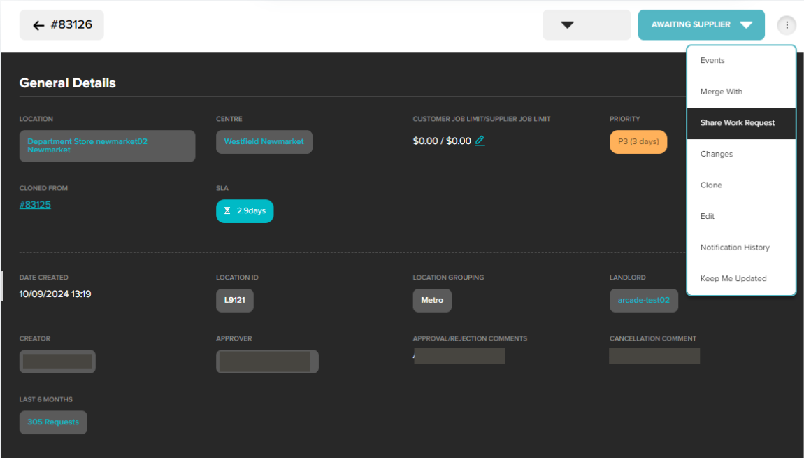 Accessible from the three dots menu on the top right of the page, you'll see "Share Work Request"