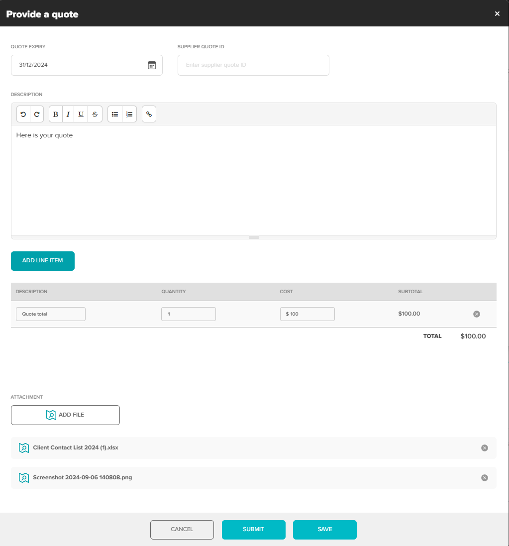 Select "Submit" to send the Quote to the Client for their approval.